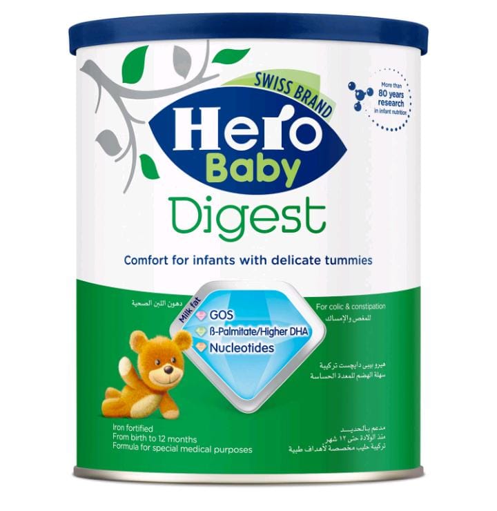 Hero Baby Digest هو حليب تركيبة كامل يُناسب الأطفال من الولادة حتى عمر 12 شهرًا، مصمم خصيصًا لتوفير راحة للجهاز الهضمي — أي للرضع الذين يعانون من المغص أو الإمساك أو الانتفاخ أو عدم الراحة في البطن.